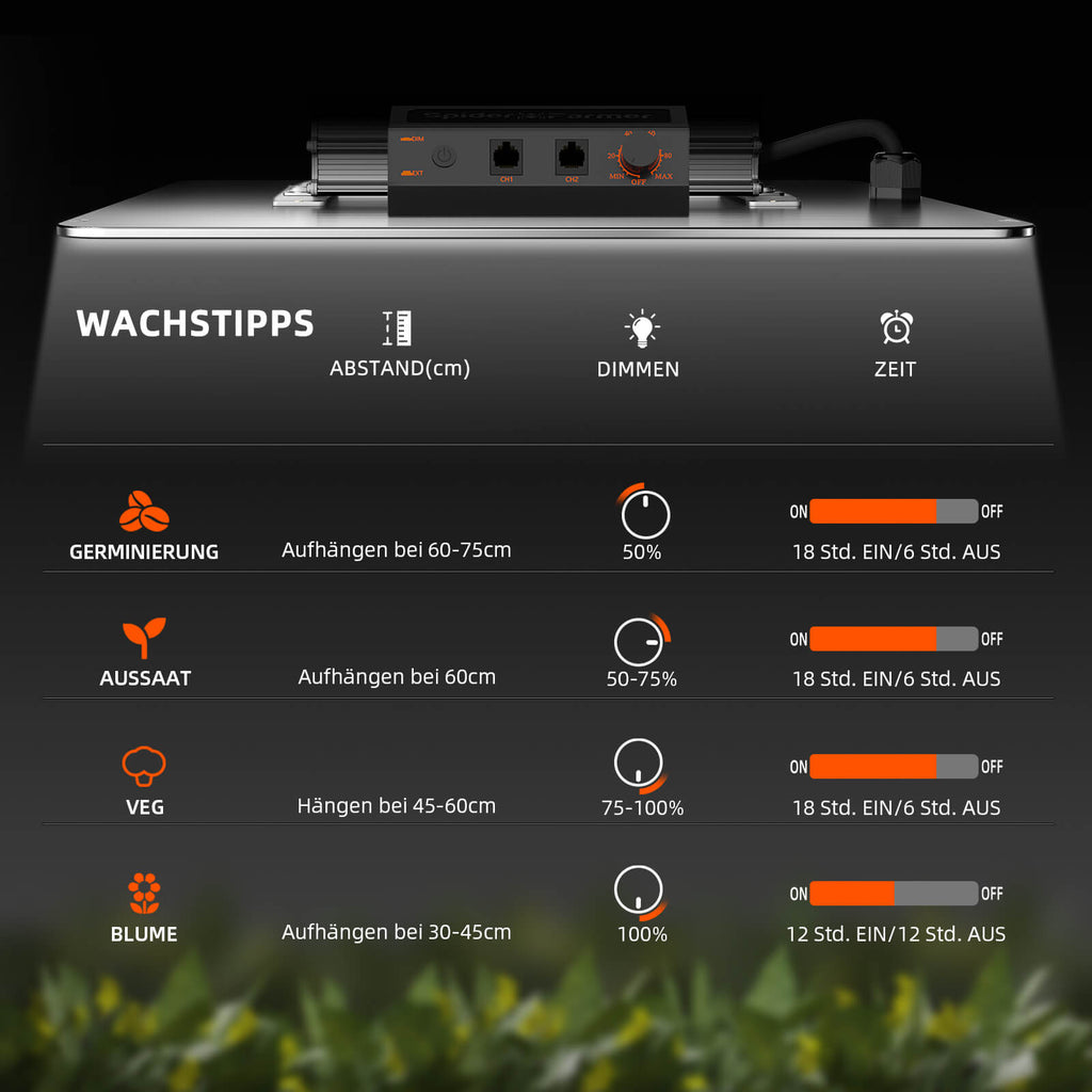 Sobib kõikidele kasvuetappidele: tuled on täisspektriga valge, sinise, punase ja IR-ga (3000K, 5000K, 660nm ja IR 760nm), et tagada taimede kasvuks optimaalsed tingimused. 3000K annab roosat valgust, 5000K sinakat ja 660nm punast valgust, samas kui IR valgus kiirendab õitsemist ja suurendab õitsemise ajal saaki.
